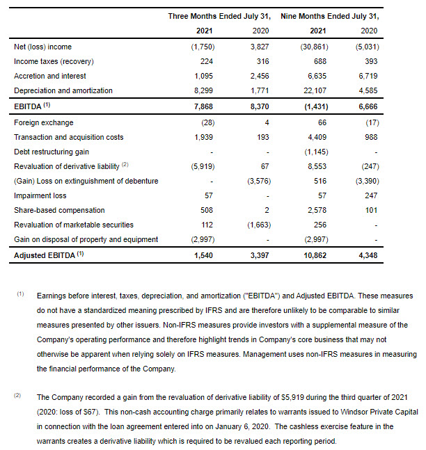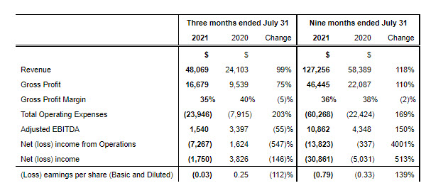 - Adjusted EBITDA(1) for the three months ended July 31, 2021, was $1.5 million compared to $3.4 million for the same quarter last year. The decrease in adjusted EBITDA was primarily due to expenses related to the up listing of the Company’s stock to Nasdaq including directors’ and officers’ liability insurance premiums, Nasdaq listing fees, one-time professional fees, and additional human resources to support the integration of newly acquired companies. As a result of the up listing to Nasdaq, the Company became a non-venture issuer resulting in higher compliance requirements.