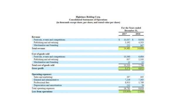 Hightimes Holdings, which continues to pursue a Reg A+ offering with the goal of selling up to $50 million in stock at $11 per share and then, hopefully, trading publicly, issued an annual report Form 1-K for 2017 that should give potential investors pause. The company reported a modest decline in sales, a large decline in gross profit, substantially higher operating expenses and, consequently, an operating loss that expanded 385% to $13.6 million.