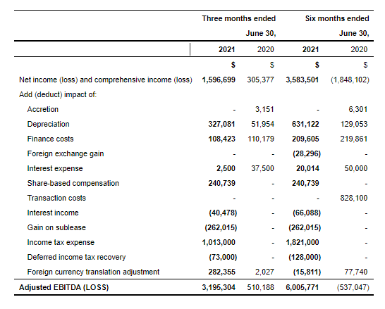 - Adjusted EBITDA(1)was USD $3.2 million in the second quarter compared to USD $0.5 million in the second quarter of 2020 USD $2.8 million in the first quarter of 2021