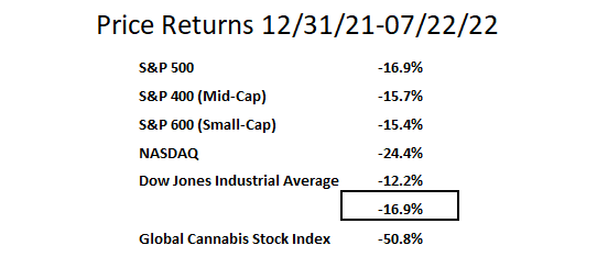 The performance of cannabis stocks remains much weaker in 2022 than the overall market’s returns: