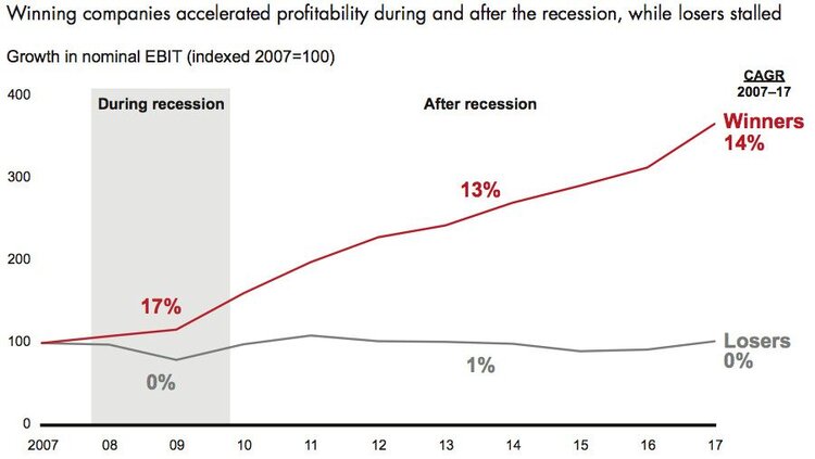 A study by Bain & Company analyzed the financial performance of more than 5,000 companies over a ten year period including the global financial crisis, and found that ‘winners’ grew at a 17% compound annual growth rate (CAGR) during the downturn, compared with 0% among the losers. What’s more, the winners locked in gains to grow at an average 13% CAGR in the years after the downturn, while the losers stalled at 1% [5].