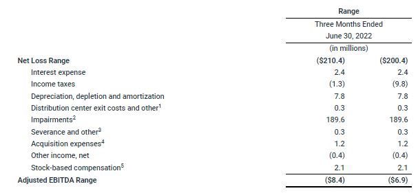 - Net loss expected to range between ($210.4) million and ($200.4) million, as compared to net income of $2.3 million for the three months ended June 30, 2021. The net loss range includes estimated non-cash expenses of $189.6 million in goodwill impairment and $10.2 million in inventory reserve recorded at the end of the second quarter.