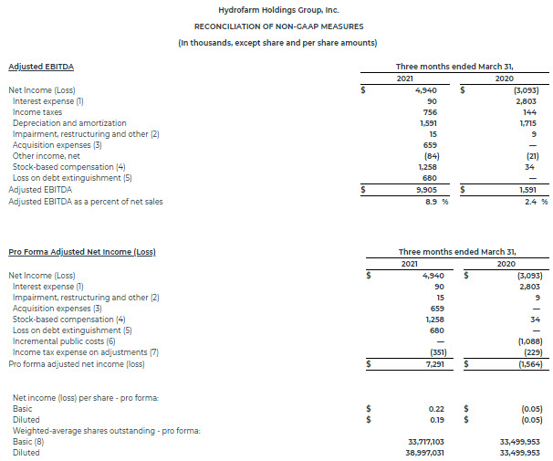 Bill Toler, Chairman and Chief Executive Officer of Hydrofarm, said, “We’re pleased to report strong results to start 2021, which included our third straight quarter of organic sales growth of approximately 60% or more and a new record quarter of Adjusted EBITDA at $9.9 million, as we continue to benefit from broad growth across our product lines, geographies, and brand categories. Our impressive results continue to be driven by demand for our differentiated branded product offerings aided by strong tailwinds from a large and rapidly growing controlled environmental agriculture end market.”