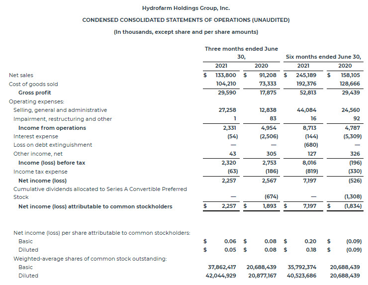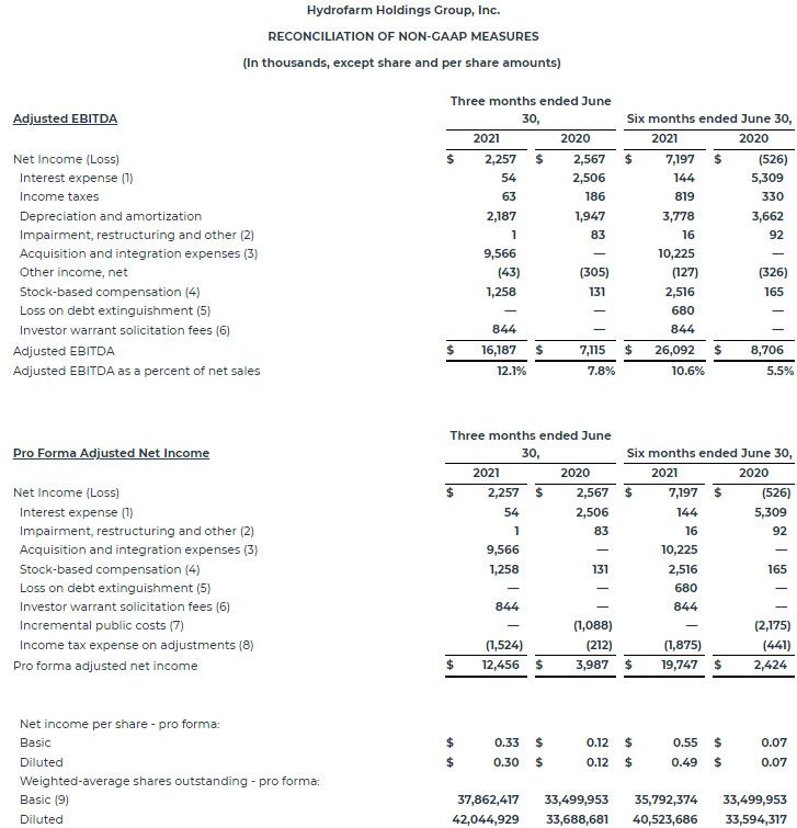 Bill Toler, Chairman and Chief Executive Officer of Hydrofarm, said, “We maintained momentum during the second quarter, as demonstrated by 47% increase in our top-line and significant improvement in our Adjusted EBITDA, which more than doubled on a dollar basis and increased considerably on margin basis. Our team also successfully executed against our acquisition strategy, completing four acquisitions during and subsequent to the second quarter, bringing four fantastic businesses in the nutrient and grow media categories under the Hydrofarm umbrella.”