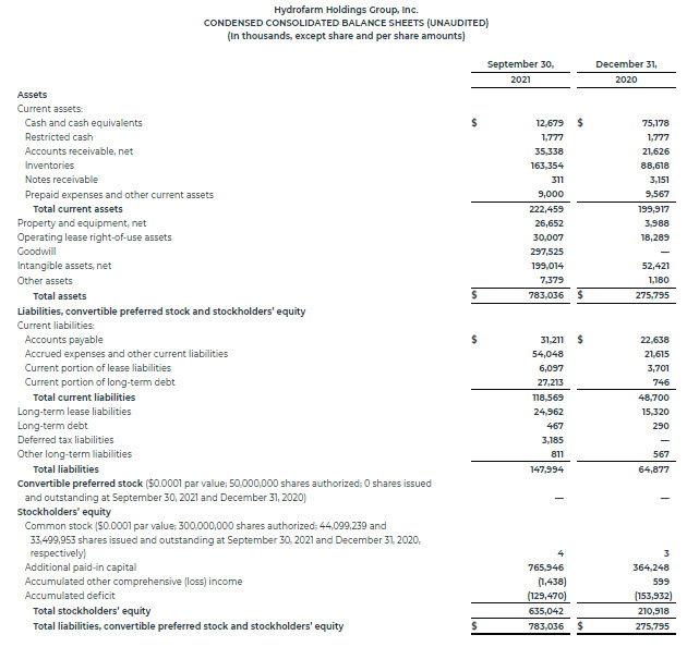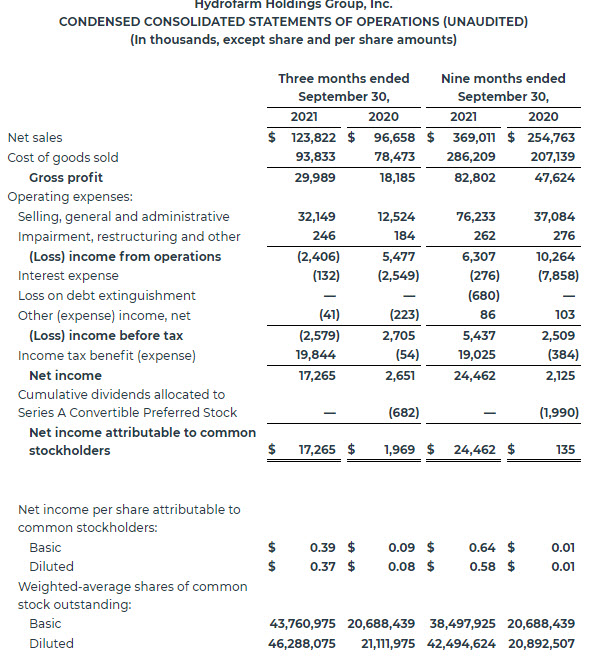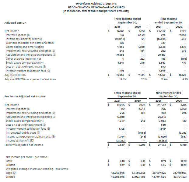 Bill Toler, Chairman and Chief Executive Officer of Hydrofarm, said, “During the third quarter, we grew our top line by over 28% and improved gross profit by over 540 basis points year-over-year. We also benefited from a reconfiguring of our product portfolio driven by this year’s M&A activity, as over 76% of our sales now come from our proprietary and preferred brands compared to approximately 65% last year, contributing to a 117% improvement in Adjusted EBITDA.”