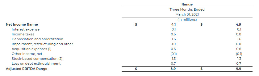 The reconciliation below is to preliminary net income and management has not completed its review of these items; therefore, actual results could differ significantly. The following table reconciles the preliminary Adjusted EBITDA range of $8.9 million to $9.9 million to the preliminary net income range of $4.1 million to $4.9 million for the three months ended March 31, 2021:
