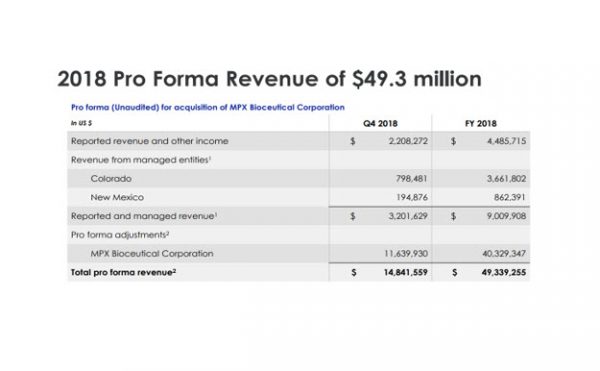 Pro forma revenue (which includes acquired MPX entities and managed revenue for Colorado and New Mexico operations*) for the fourth quarter was $14.8 million and $49.3 million for the full year fiscal 2018.
