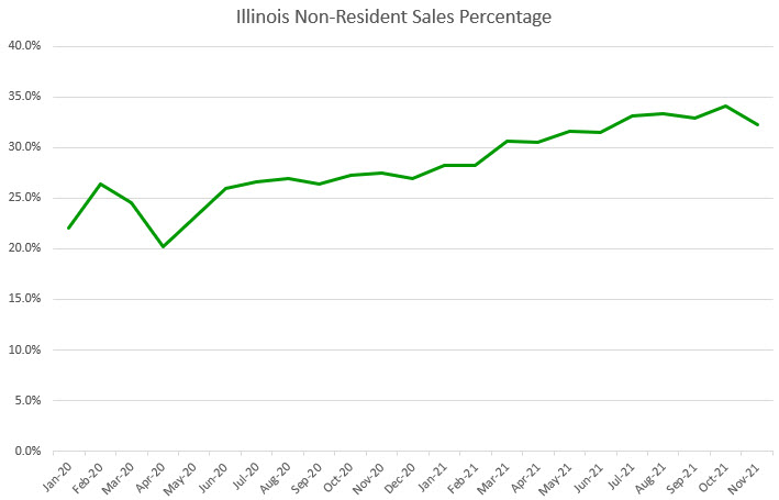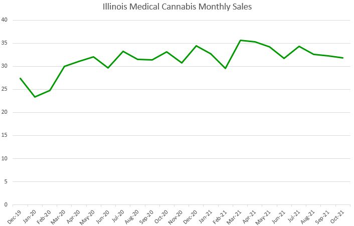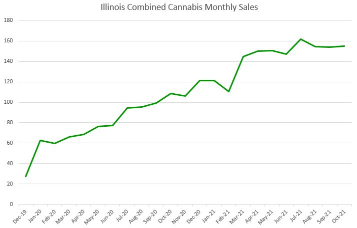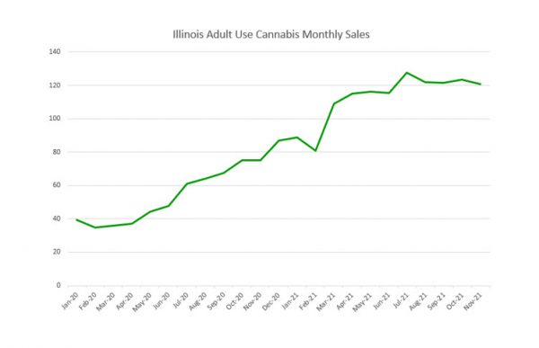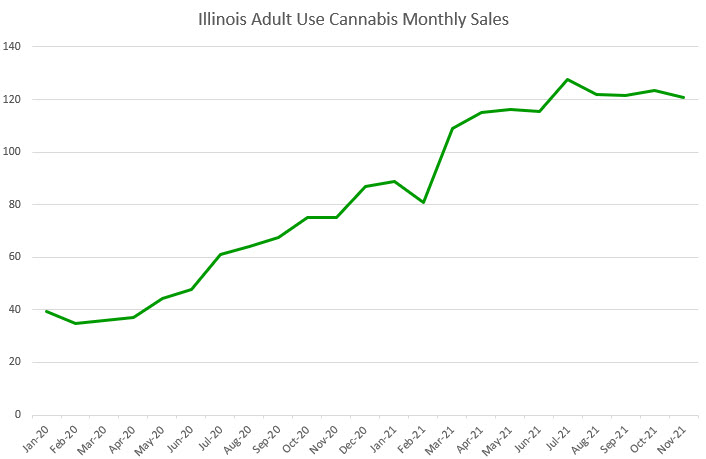 Illinois adult-use cannabis sales reached $120.75 million in November, down 2.1% from October, which had one more day, and up 61% from a year ago: