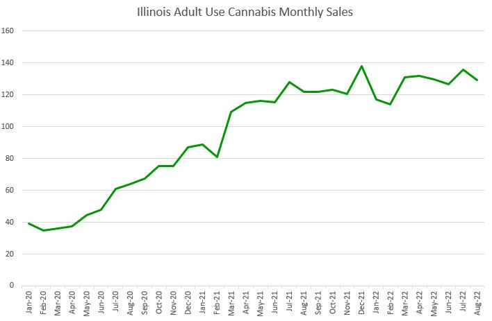 Illinois adult-use cannabis sales of $129.4 million decreased 4.6% sequentially in August. Compared to a year ago, growth was the same as the 6.2% rate in July: