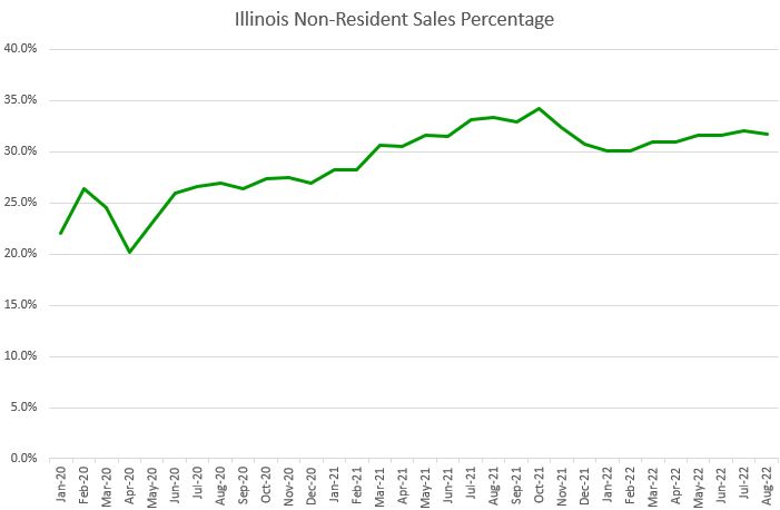 2021 adult-use sales of $1.38 billion increased 106% over 2020 in Illinois, and year-to-date sales of $886.26 million have increased 16.0% so far in 2022. During August, sales to non-residents decreased from 32.1% in July to 31.8% of total sales: