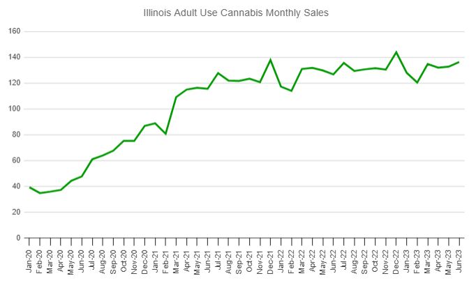 Illinois adult-use cannabis sales in June were up a bit sequentially to $136.4 million, a gain of 2.7% despite one less day than May. The gain was 7.6% from a year ago: