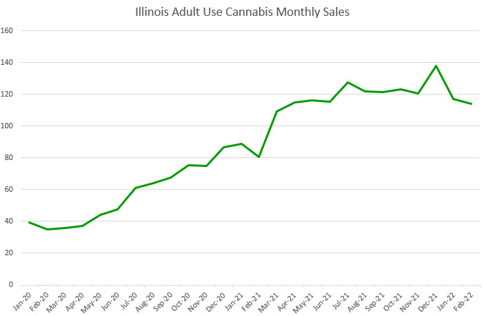 After a sharp drop in January, when adult-use sales fell 15% sequentially as they rose 32% from the prior year, Illinois adult-use cannabis sales stabilized in February. Sales of $114 million fell 3% from January, but there were three fewer days during the month. Compared to a year ago, growth accelerated to 41%: