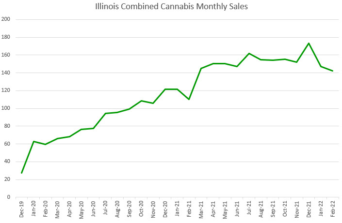 In 2021, combined cannabis sales in Illinois totaled $1.78 billion, up 72% from 2020, and so far in 2022 they have increased 25% compared to a year ago.