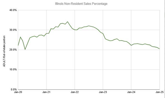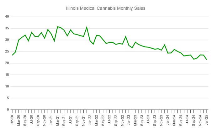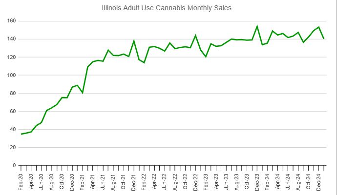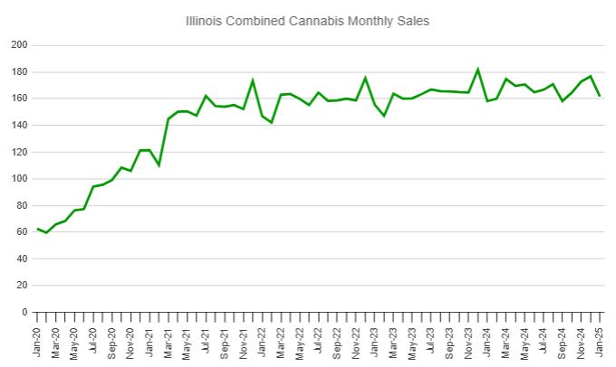 Illinois released sales figures for adult-use cannabis in January today, a bit later than normal. They were down 8.5% sequentially to $140.2 million. The year-over-year growth was 4.8%, better than the decline in December: