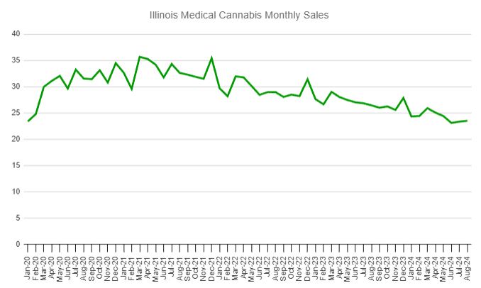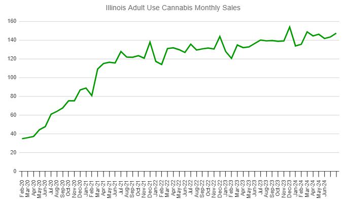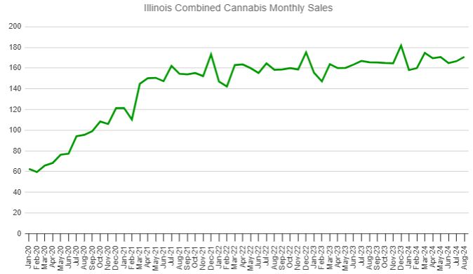 Illinois released sales figures for adult-use cannabis in July and August today. They were up 1.1% sequentially in July to $143.3 million, and they rose in August by 2.8% to $147.4 million. The year-over-year growth was a low 2.4% in July, but it increased to 5.9% in August: