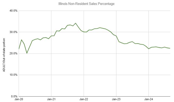 After increasing 106% in 2021, 13% in 2022 and then 5% in 2023, year-to-date adult-use sales are up 7.3% in 2024 to $$1.14 billion. During August, sales to non-residents were 22.4%: