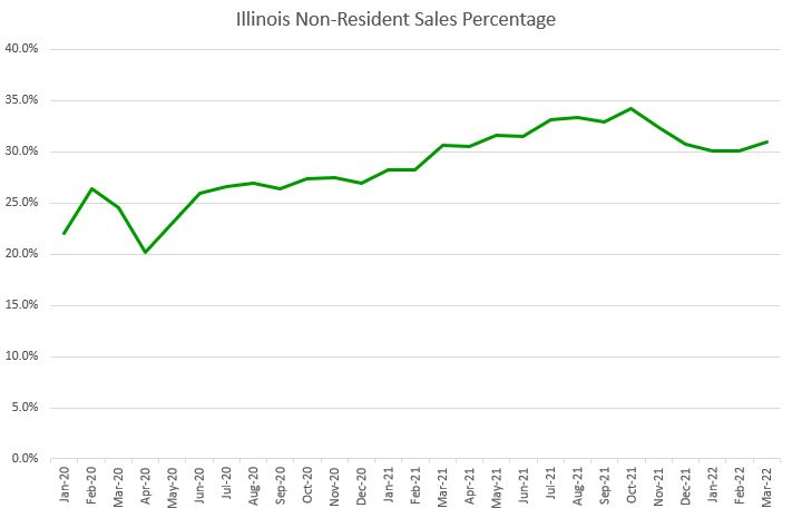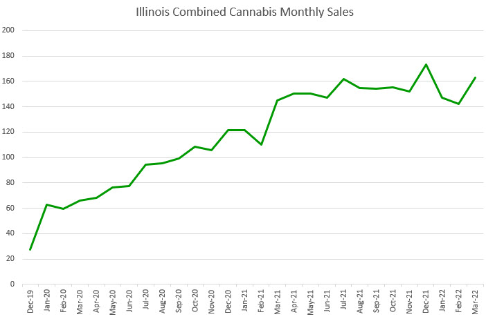 In 2021, combined cannabis sales in Illinois totaled $1.78 billion, up 72% from 2020, and so far in 2022 they have increased 20% compared to a year ago.