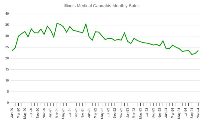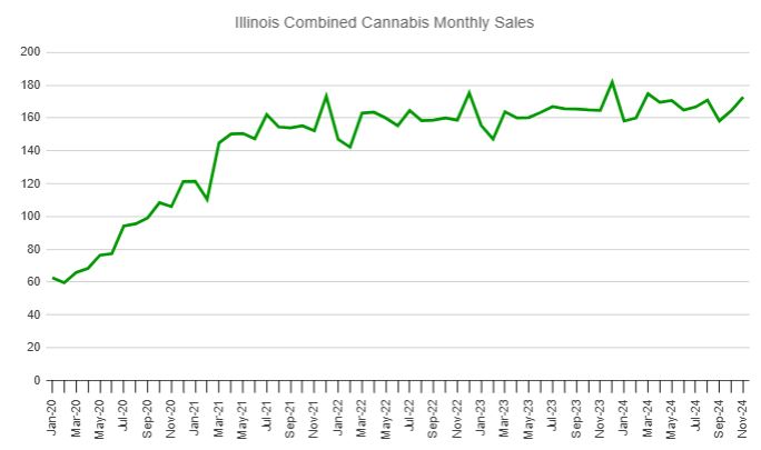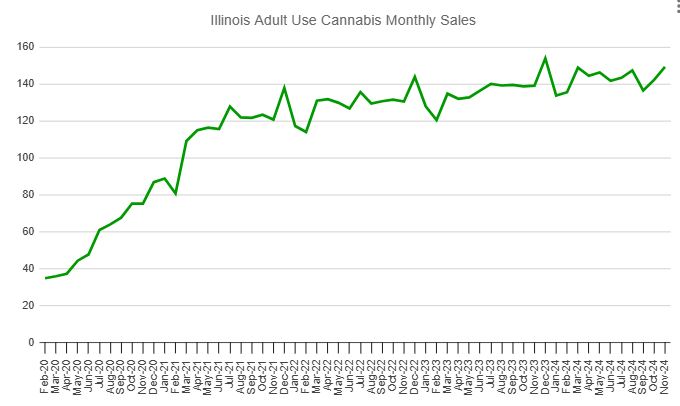 Illinois released sales figures for adult-use cannabis in November today. They were up 4.9% sequentially to $149.3 million. On a per-day basis, sales rose 8.4%. The year-over-year growth was +7.3%, better than the +2.5% in October after the first decline ever recorded in September: