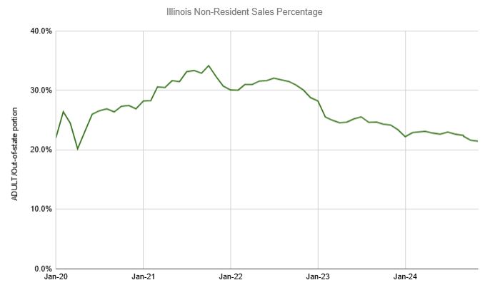 After increasing 106% in 2021, 13% in 2022 and then 5% in 2023, year-to-date adult-use sales are up 6.0% in 2024 to $$1.14 billion. During November, sales to non-residents were 21.5%: