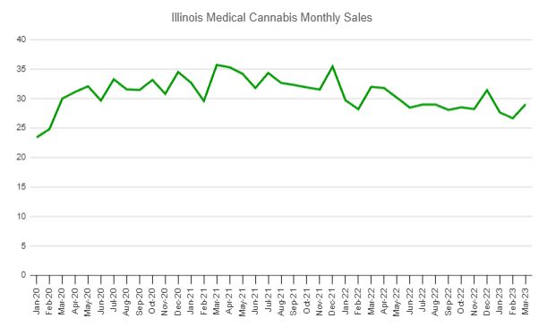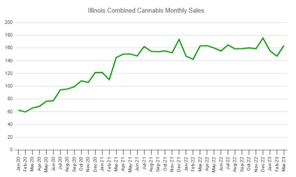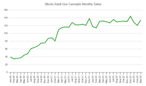 After surging to end the year and then falling in January and February, Illinois adult-use cannabis sales rose 11.9% sequentially in March to $134.8 million, which was up 1.0% per day. March sales were below December’s and the record in October, but they rose 2.9% from a year ago: