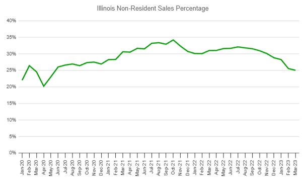 During March, sales to non-residents decreased from 25.5% in February to 25.0%, the lowest since May 2020, perhaps trigged by adult-use legalization in neighboring Missouri: