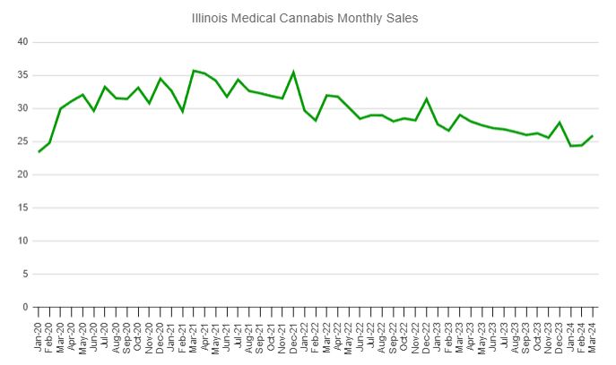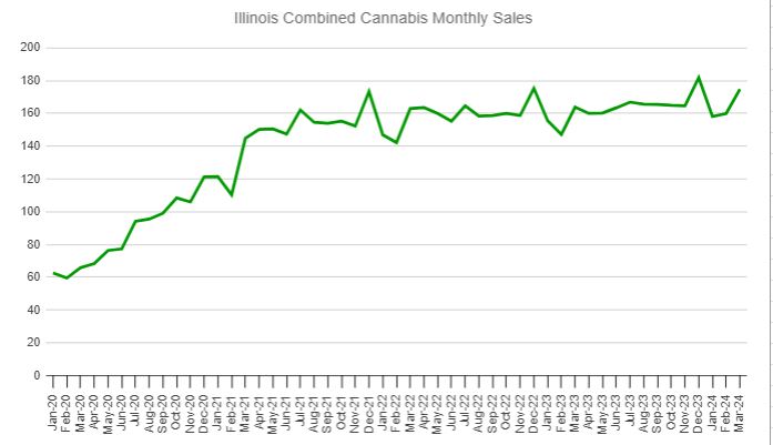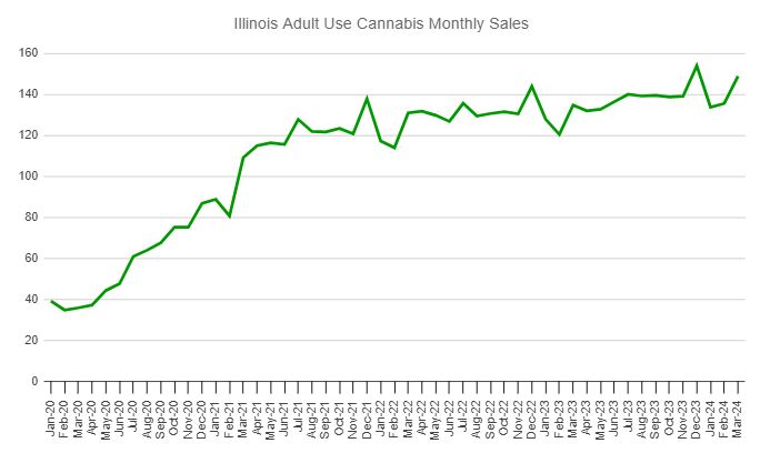 Illinois adult-use cannabis sales in March were up 9.8% sequentially to a $148.9 million, which was up by more than the increase in the length of the month. The gain was 10.4% from a year ago: