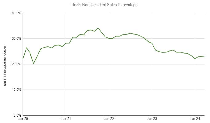 After increasing 106% in 2021, 13% in 2022 and then 5% in 2023, year-to-date adult-use sales are up 9.1% in 2024 to $492 million. During March, sales to non-residents were 23.1%:
