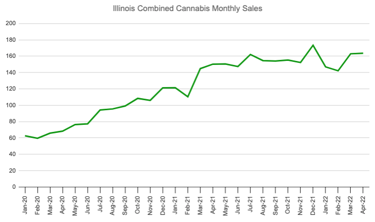 In 2021, combined cannabis sales in Illinois totaled $1.78 billion, up 72% from 2020, and so far in 2022 they have increased 17% compared to a year ago.
