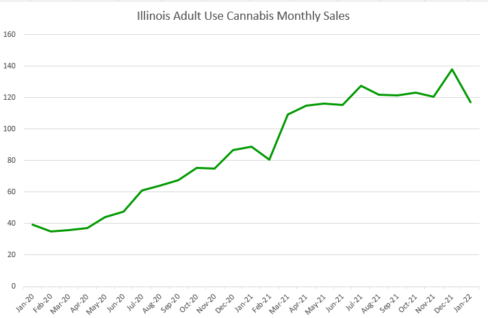 In 2021, combined cannabis sales in Illinois totaled $1.78 billion, up 72% from 2020.