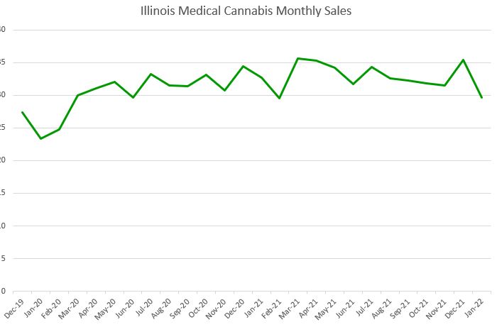 The state separately releases sales from its medical program. In January, medical sales totaled $29.7 million, down 9% from the prior year and down 16% sequentially:
