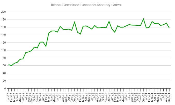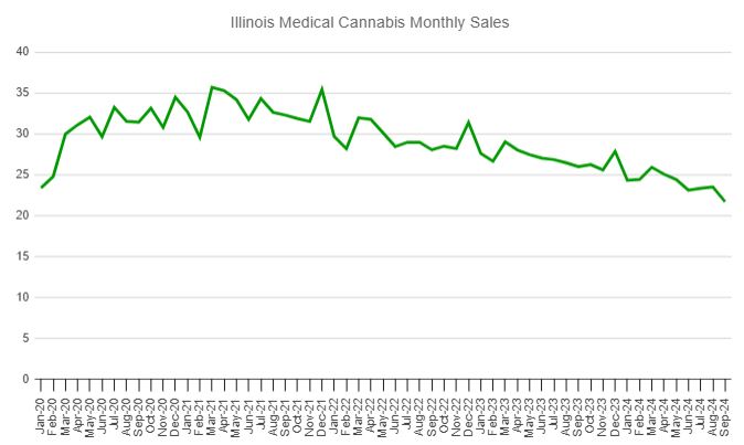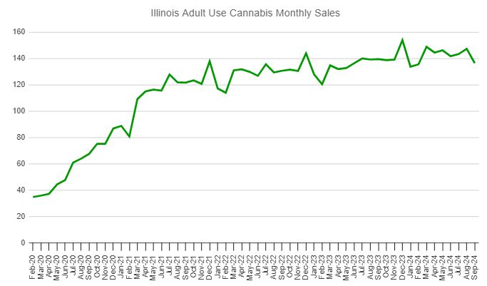 Illinois released sales figures for adult-use cannabis in September today. They were down 7.4% sequentially to $136.5 million. On a per-day basis, sales fell 4.3%. The year-over-year growth was -2.2%, the first decline recorded: