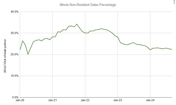 After increasing 106% in 2021, 13% in 2022 and then 5% in 2023, year-to-date adult-use sales are up 7.3% in 2024 to $$1.14 billion. During September, sales to non-residents were 22.3%: