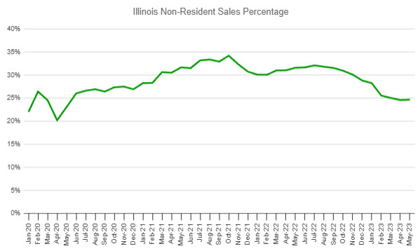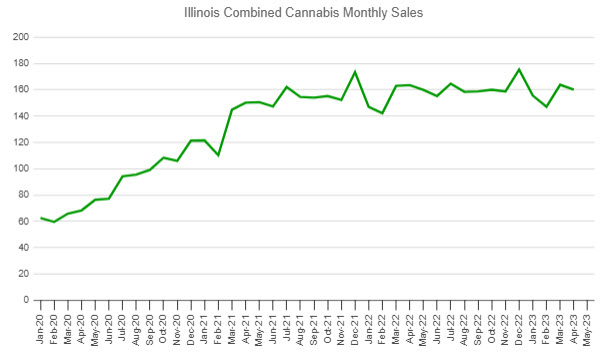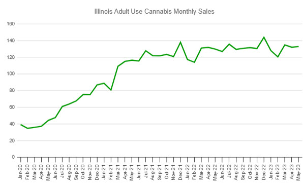 Illinois adult-use cannabis sales in May were up a bit sequentially to $100.0 million, but this gain of 0.6% was less than the expansion of the number of days by 3.3%. The gain was 2.3% from a year ago: