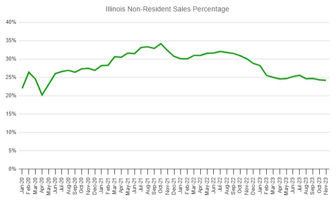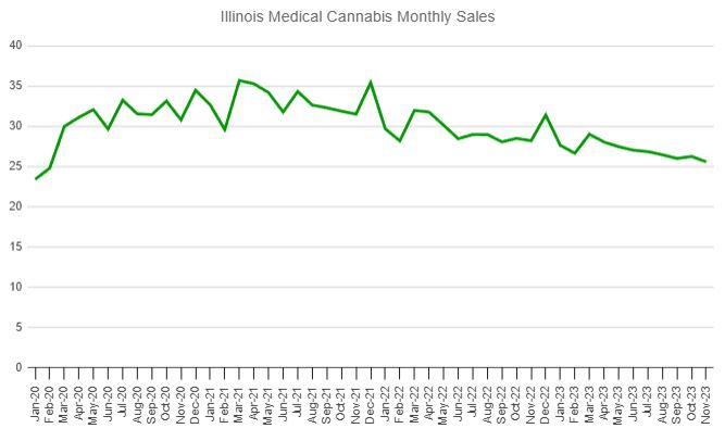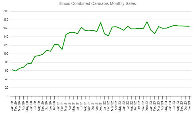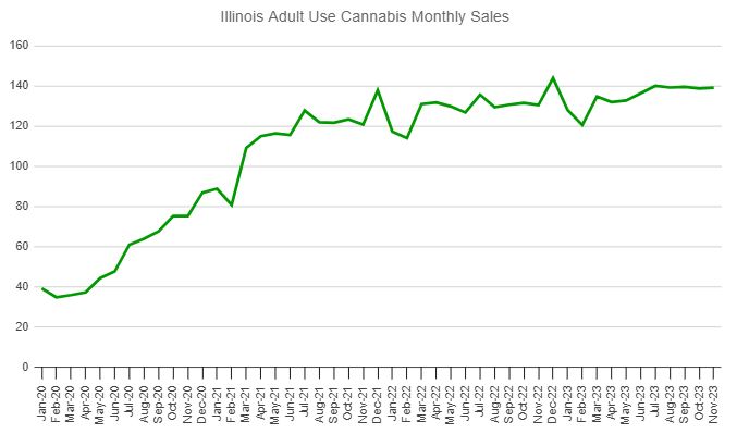 Illinois adult-use cannabis sales in November were up slightly sequentially to $139.1 million, an increase of 0.3% from October despite one less day. The gain was 6.6% from a year ago: