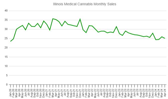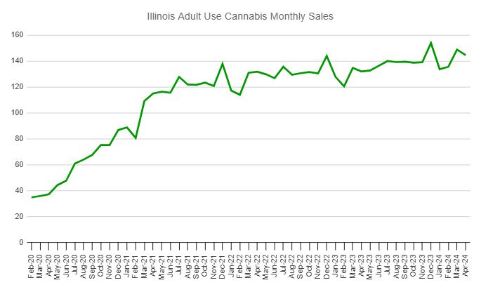 Illinois released its cannabis sales data much later than it normally does. Illinois adult-use cannabis sales in April were down 2.9% sequentially to a $144.5 million, which was about the same on a per-day basis as the longer March. The gain was 9.5% from a year ago: