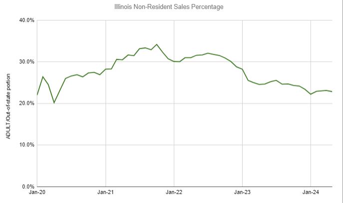 After increasing 106% in 2021, 13% in 2022 and then 5% in 2023, year-to-date adult-use sales are up 9.2% in 2024 to $662 million. During April, sales to non-residents were 22.8%: