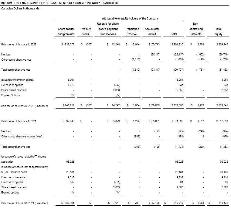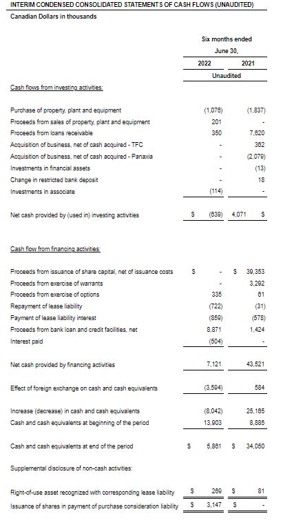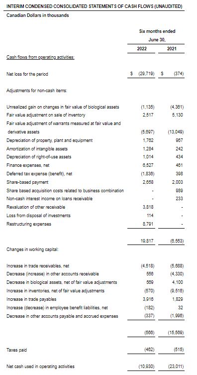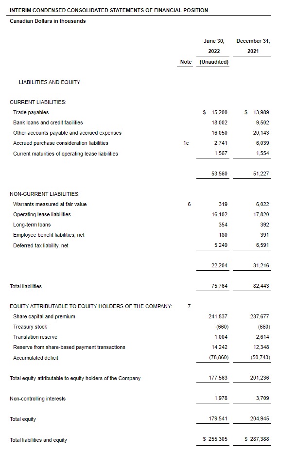 - Net loss was $18.98 million in Q2 2022 compared to net loss of $5.01 million in Q2 2021. Included in the net loss was a non-cash charge of $5.4 million, related to restructuring activities in Canada and Israel, along with associated write-downs in tangible and intangible assets, such as other non-cash impairments of $1.5 million in financial expenses and $3.8 million in general and administrative costs.