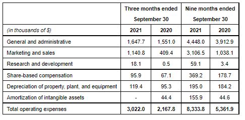 - Operating expenses in the quarter were flat sequentially at $3.0 million versus Q2 2021 driven by higher marketing costs, offset by lower sales commissions. Operating expenses as a percentage of net revenue increased to 39.2% in Q3 2021 versus 34.1% in Q2 2021, but decreased significantly versus 71.6% in Q3 2020. Year over year, operating expenses increased by 39.4% versus Q3 2020, primarily due to higher marketing and sales commissions driven by higher sales volumes, and higher public company costs. Year-to-date, operating expenses increased by 55.4% to $8.3 million, but declined as a percentage of revenue to 36.2% from 70.5%. The Company expects operating expenses to continue to decline as a percentage of net revenue as the year progresses, and into 2022.