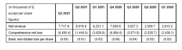 - Comprehensive net loss was $6.43 million for the quarter and included one-time expenses and non-cash charges totaling $5.44 million. Net loss per share was $0.05 versus $0.04 in Q3 2020. Excluding these charges, comprehensive loss in the quarter declined to $0.99 million, or $0.01 per share, versus a loss of $2.13 million in Q3 2020.