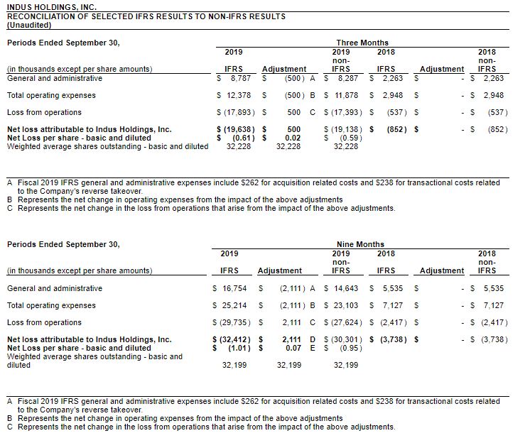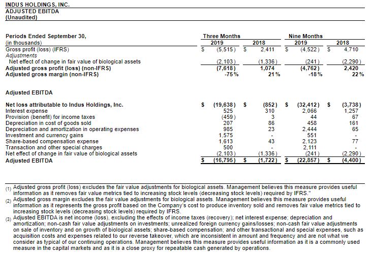 To supplement the Company’s financial results presented in accordance with International Financial Reporting Standards (“IFRS”), Indus uses non-IFRS measures to understand and compare operating results across accounting periods, for financial and operational decision making, for planning and forecasting purposes and to evaluate the Company’s financial performance. These non-IFRS financial measures are adjusted EBITDA, adjusted gross profit, adjusted gross margin, and non-IFRS net earnings (loss). Management believes that these non-IFRS financial measures reflect the Company’s ongoing business in a manner that allows for meaningful comparisons and analysis of trends in the business, as they facilitate comparing financial results across accounting periods and to those of peer companies. Management also believes that these non-IFRS financial measures enable investors to evaluate the Company’s operating results and future prospects in the same manner as management. These non-IFRS financial measures may also exclude expenses and gains that may be unusual in nature, infrequent or not reflective of the Company’s ongoing operating results. Since these measures are not calculated in accordance with IFRS, they should not be considered in isolation of, or as a substitute for, our reported results as indicators of our performance, and they may not be comparable to similarly named measures from other companies. The tables below reconcile our results of operations in accordance with IFRS to the adjusted results mentioned above: