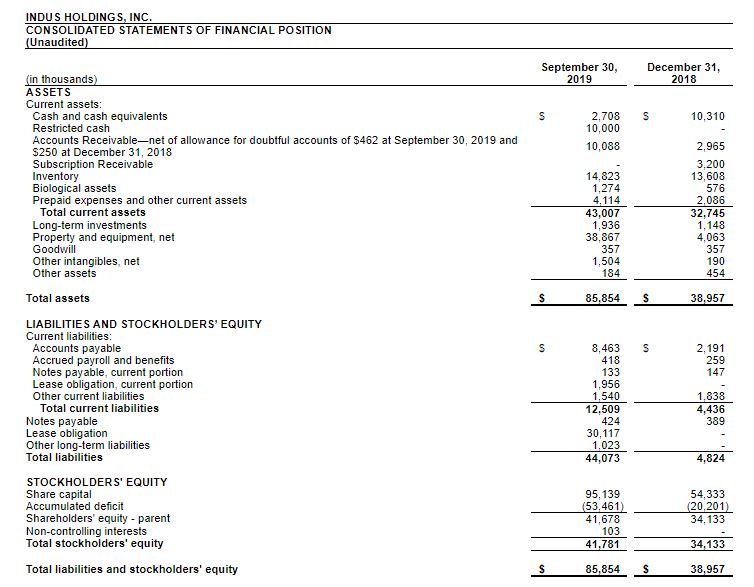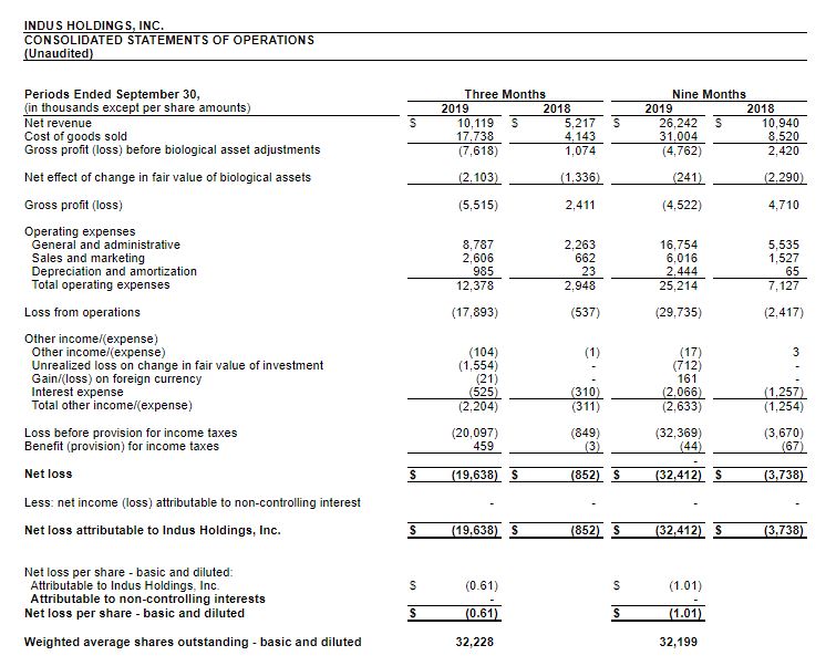 Indus Holdings, Inc. Reports Third Quarter 2019 Financial Results