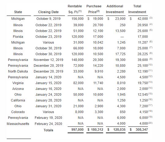 IIP acquired the following properties and made the following additional funds available to tenants for improvements at IIP’s properties during the period from October 1, 2019 through February 26, 2020 (dollars in thousands):