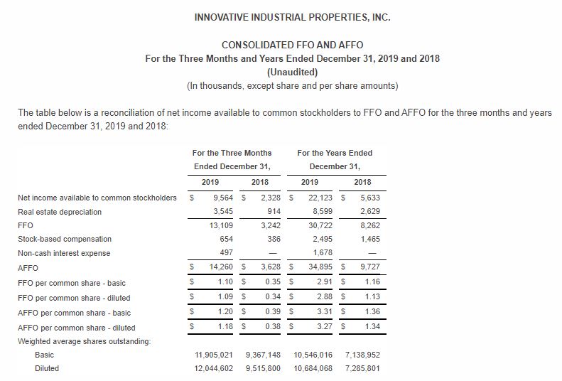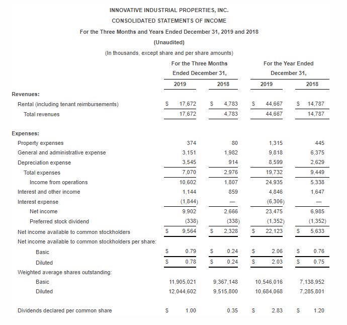 Innovative Industrial Properties Reports Fourth Quarter and Full-Year 2019 Results