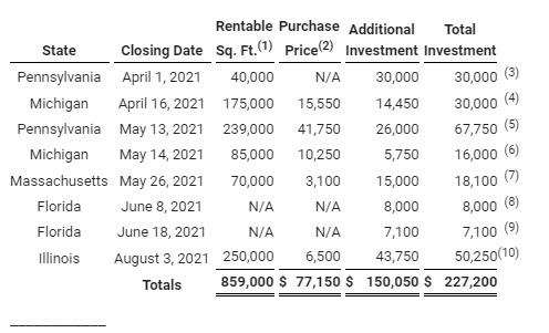 IIP acquired the following properties and made the following additional funds available to tenants for improvements at IIP’s properties during the period from April 1, 2021 through today (dollars in thousands):
