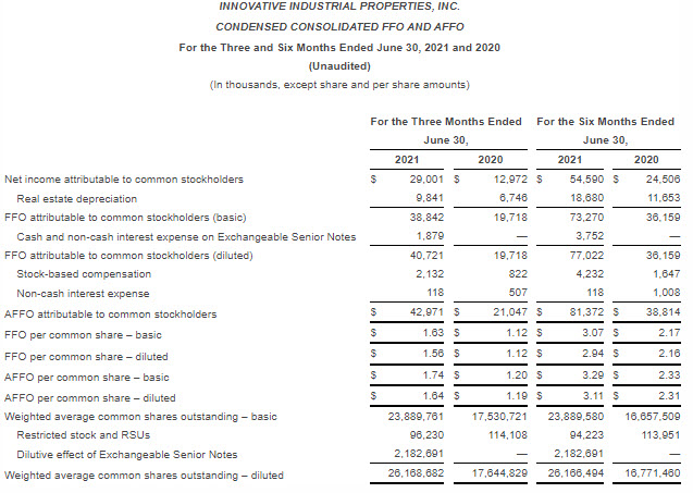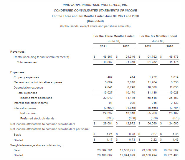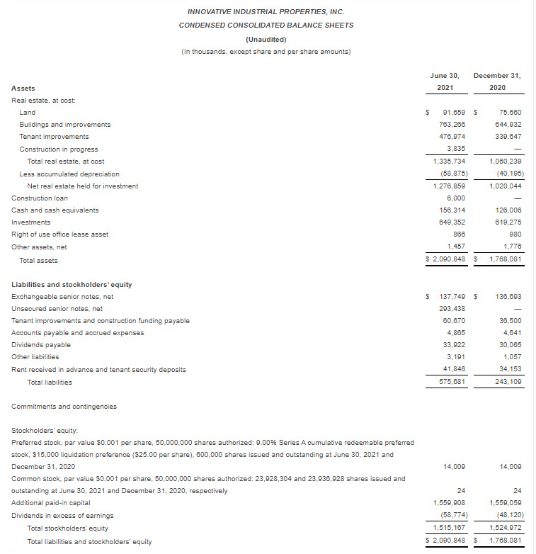 Innovative Industrial Properties Reports Second Quarter 2021 Results