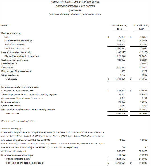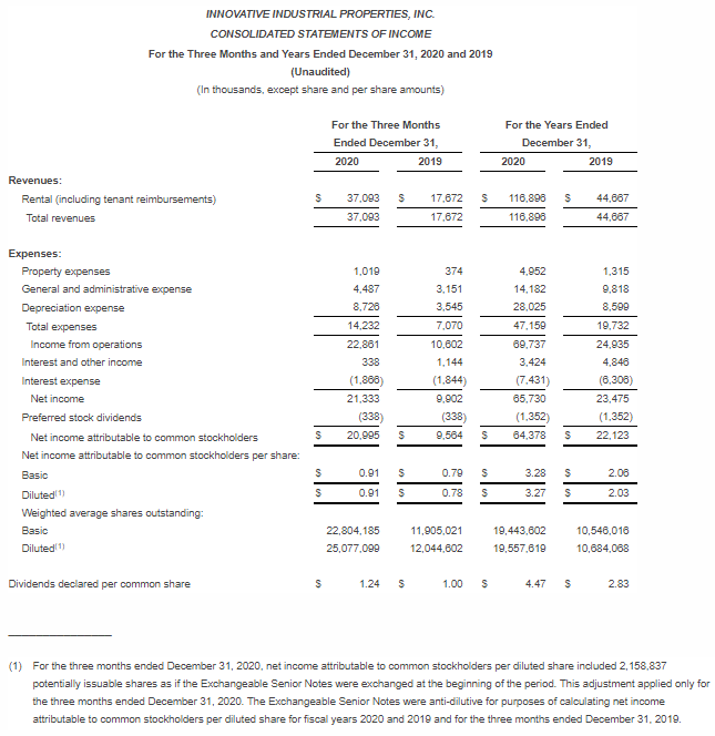 Innovative Industrial Properties Reports Fourth Quarter and Full-Year 2020 Results