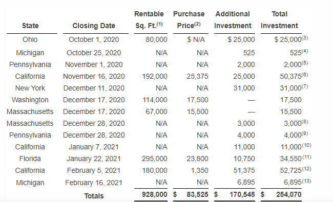 - In these transactions, established new tenant relationships with 4Front Ventures Corp. (4Front) and Harvest Health & Recreation Inc. (Harvest), while expanding existing tenant relationships with Green Peak Industries LLC, Green Thumb Industries Inc. (GTI), Holistic, Kings Garden Inc., LivWell Holdings, Inc. and PharmaCann Inc.