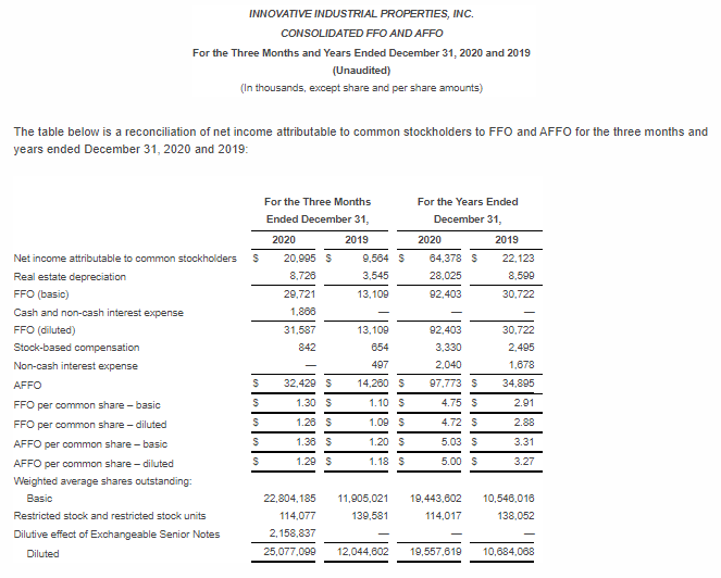 For the year ended December 31, 2020, IIP recorded net income attributable to common stockholders and net income attributable to common stockholders per diluted share of $64.4 million and $3.27, respectively; FFO (diluted) and FFO per diluted share of $92.4 million and $4.72, respectively; and AFFO and AFFO per diluted share of approximately $97.8 million and $5.00, respectively. The Exchangeable Senior Notes were anti-dilutive for purposes of calculating earnings per diluted share for both 2020 and 2019, and as such, treated as anti-dilutive for purposes of calculating FFO, AFFO and FFO and AFFO per diluted share for both years.