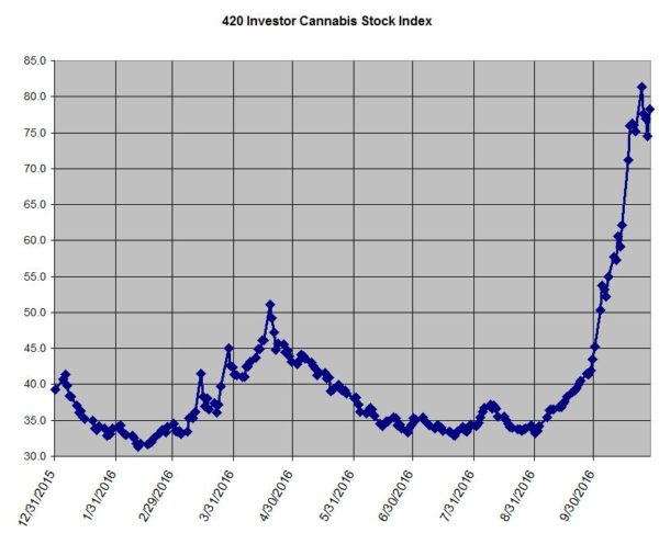Cannabis stocks have rallied dramatically in the past two months, with the Cannabis Stock Index more than doubling from the end of August, rising 136% from 33.16 on 8/31 to 78.23 on 10/28: