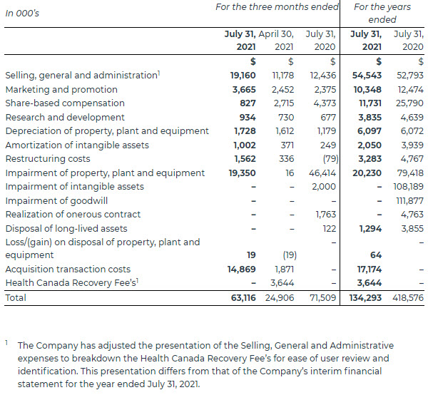 In this press release, reference is made to gross profit before adjustment, profit/margin before fair value adjustments, adjusted gross profit/margin, adjusted EBITDA, and revenue per gram equivalent which are not measures of financial performance under International Financial Reporting Standards (IFRS). These metrics and measures are not recognized measures under IFRS, do not have meanings prescribed under IFRS, and are unlikely to be comparable to similar measures presented by other companies. These measures are provided as information complementary to those IFRS measures by providing a further understanding of our operating results from the perspective of management. As such, these measures should not be considered in isolation or in lieu of a review of our financial information reported under IFRS. Definitions and reconciliations for all terms above can be found in the Company’s Management’s Discussion and Analysis for the fiscal year ended July 31, 2021, filed under the Company’s profile on SEDAR at www.sedar.com and EDGAR at www.sec.gov respectively